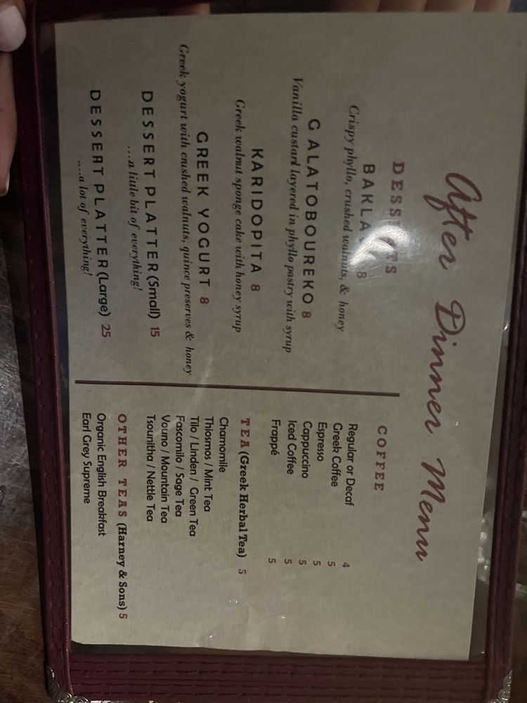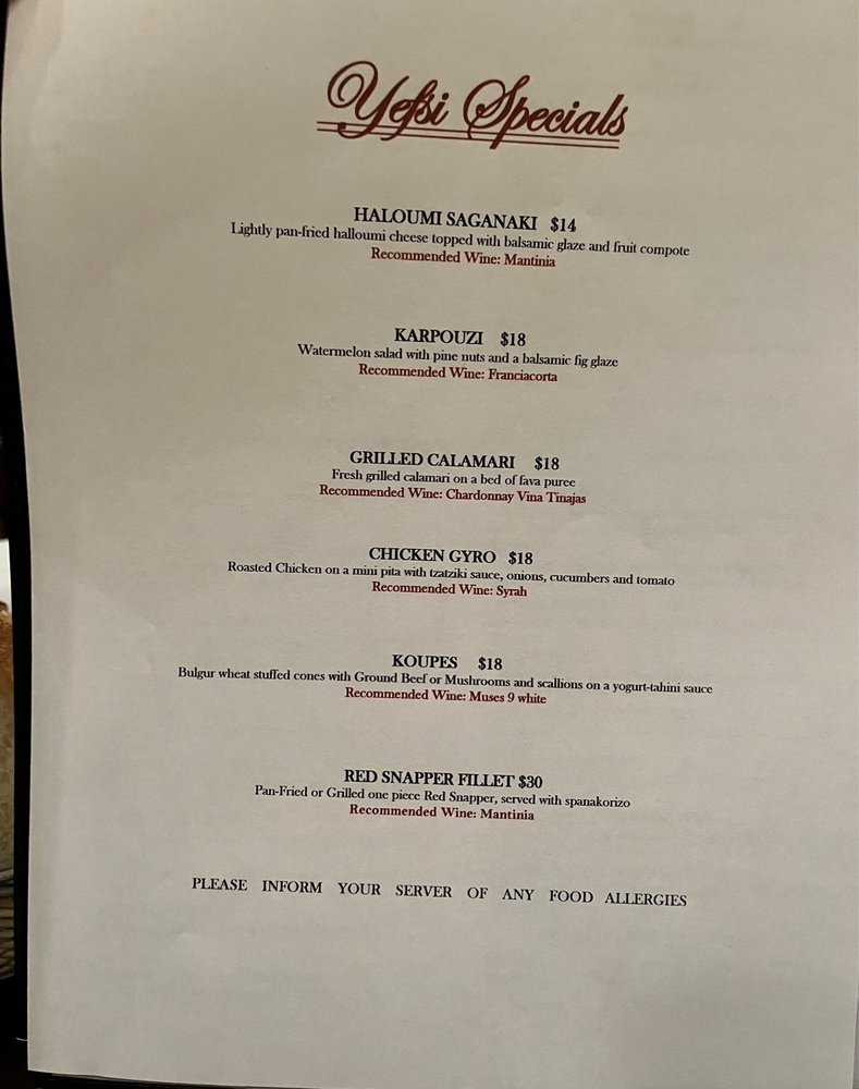 Yefsi Estiatorio, a Greek restaurant located in New York, offers a diverse menu with options for everyone. From traditional Avgolemono chicken soup to Calamari with a garlic lemon yogurt sauce, the dinner Mezedes are sure to tantalize your taste buds. The selection of spreads includes Fava Santorini, Hummus, LEMON HUMMUS, Melitzanosalata, and Pikilia, served with fresh pita bread. The dinner Salates range from a classic Horiatiki Salad to a unique Roka Salad with baby Arugula, poached pears, and toasted walnuts. With plenty of vegetarian options and a welcoming atmosphere, Yefsi Estiatorio provides a delightful dining experience. Don't miss the chance to try their flavorful dishes and enjoy the cozy ambiance for a memorable meal.